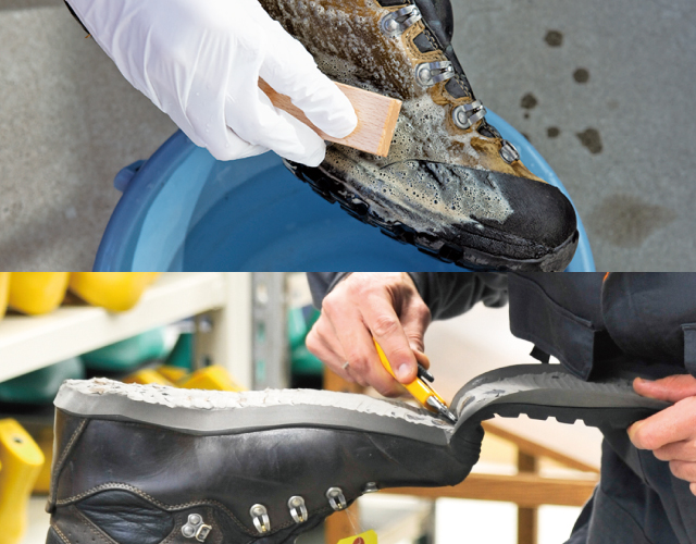 登山靴のコンディションを良好に保つためには、山行前と帰宅後には登山靴の状態を確認し、こまめにメンテナンスを行いましょう。特にソールは、使用していなくても経年劣化で剥がれることがあるので、使用前には入念にチェックします。メンテナンス方法や交換パーツ、修理については下記ページをご覧ください。
