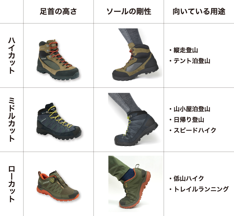 ハイカットブーツとローカットブーツの中間的な性能を持っており、比較的荷物の少ない山小屋泊登山や日帰り登山に適しています。