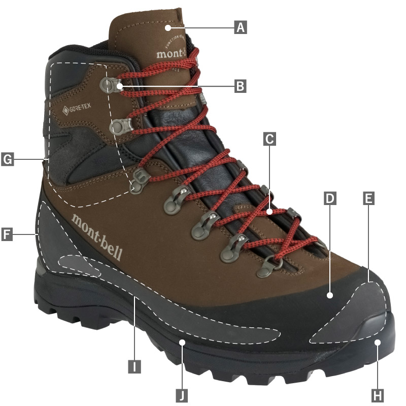 I:シャンク…ソールのねじれを防ぎ、ブーツの剛性を高めるためのプレート。岩場や重装備でも安定した歩行をサポートします。