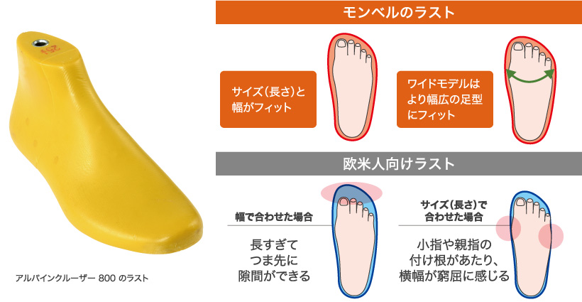 日本人の足は欧米人に比べて、幅広タイプが多いといわれています。モンベルでは、日本人に多い足の形に合わせたラスト(靴の原型となる木型)を独自開発しました。