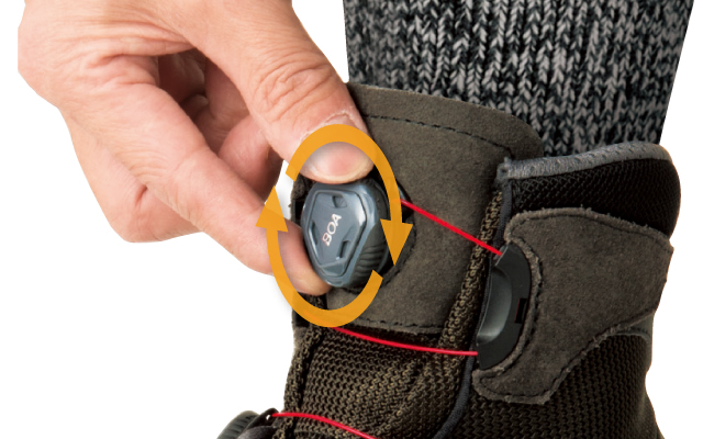 「BOAフィットシステム」はダイヤルを回すことで素早くフィット感の調節ができ、脱ぎ履きも容易に行えます。グローブをしたままでも操作することができます。